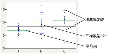 平均誤差バーと標準偏差線は、赤い三角ボタンをクリックし、メニューから[平均と標準偏差]オプションを選択すると表示されます。平均線、平均誤差バー、標準偏差線を参照してください。平均誤差バーと標準偏差線の表示/非表示を個別に切り替える場合は、[表示オプション]>[平均誤差バー]または[標準偏差線]をそれぞれ選択します。