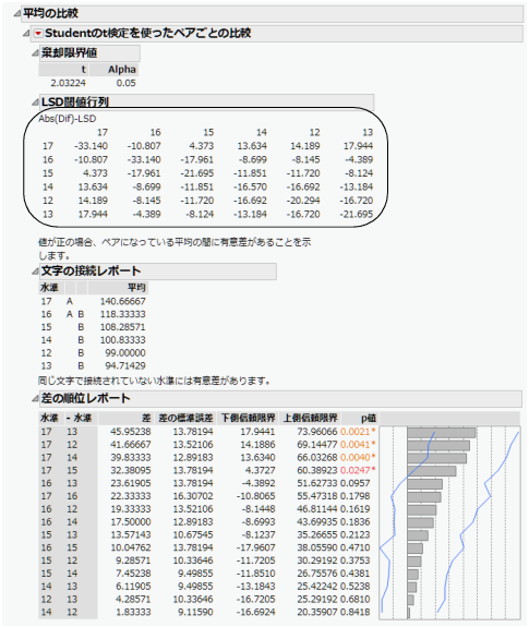 「Studentのt検定を使ったペアごとの比較」レポートの例の先頭に表示されている行列は、観測された平均の差の絶対値から、LSD(最小有意差; 検定が有意となる差)を引いたものです。値が正の場合、観測された平均の差がLSDよりも大きいことを意味していますので、2つの平均には有意差があると結論できます。