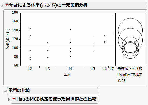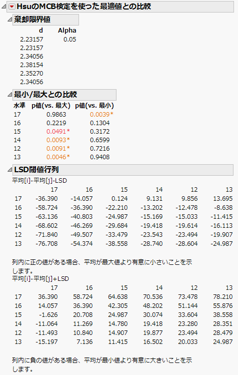 赤い三角ボタンをクリックし、メニューから[平均の比較]>[最適値との比較,HsuのMCB検定]を選択します。