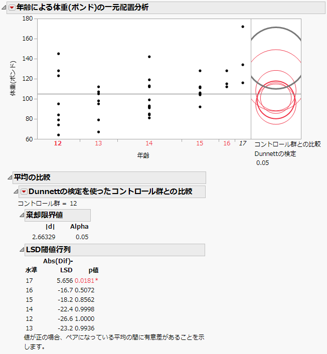 [コントロール群との比較(Dunnett)]の比較円の例の比較円を見ると、水準17だけが、コントロール群である水準12と有意に異なることがわかります。
