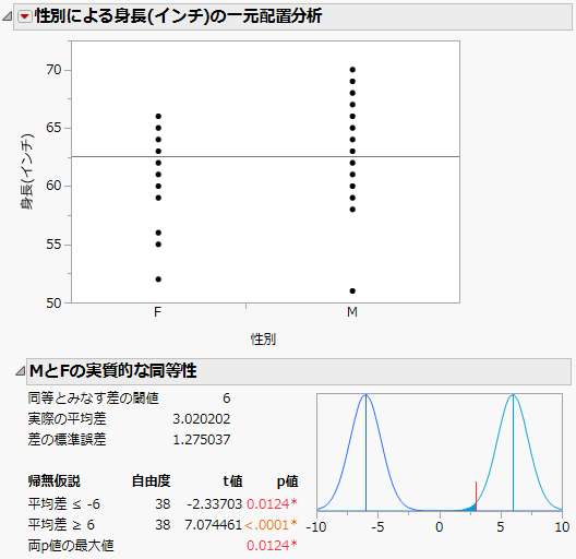 この例では、「Big Class.jmp」サンプルデータテーブルを使用して、 男性と女性の身長差が6インチ未満かどうかを調べます。
