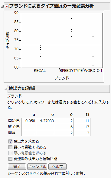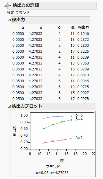 レポートの下部にある赤い三角ボタンをクリックし、メニューから[検出力プロット]を選択します。