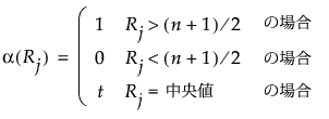 j番目の観測値の中間順位。中間順位は、同順位がない場合には、通常の順位です。同順位があった場合は、それらの同順位のものの順位の平均(中間値)です。
