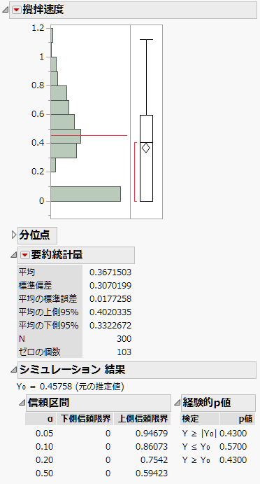 「要約統計量」レポートによると、シミュレーションのうち103/300 = 34.3%で、「攪拌速度」の推定値がゼロになっていることがわかります。