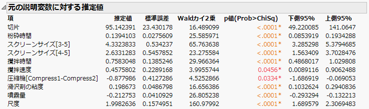 モデルの縮小に進む前に、「Tablet Production.jmp」データテーブルで、列が選択されていないことを確認します。列が選択されたままだと、後述の手順1でも選択された状態になります。列の選択を解除しておくと、誤ってゼロの項の列を含めてしまうことが避けられます。