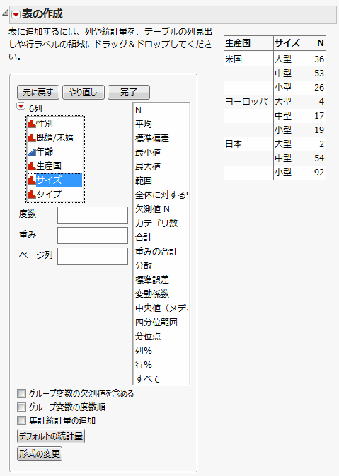 [平均]と[標準偏差]の両方を選択してドラッグし、「大型」見出しの下にドロップします。