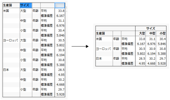 「サイズ」を表の上部に移動し、クロス表形式にします。「サイズ」を上部に移動のような表を作成します。