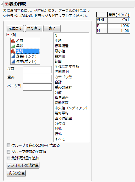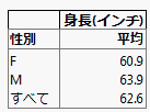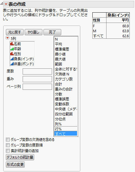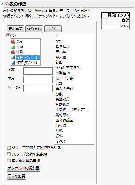 「身長(インチ)」をクリックし、「列のドロップゾーン」にドラッグします。