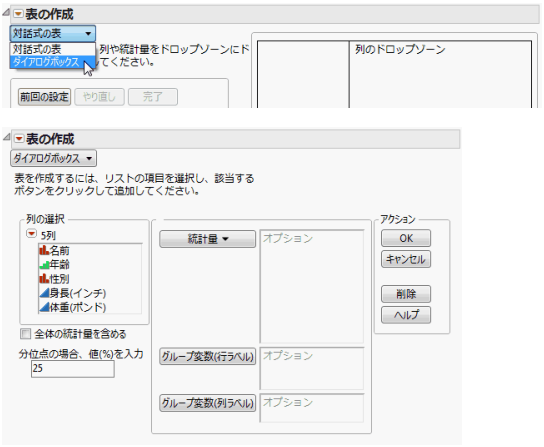 を参照)。表の作成後、必要であれば赤い三角ボタンのメニューから