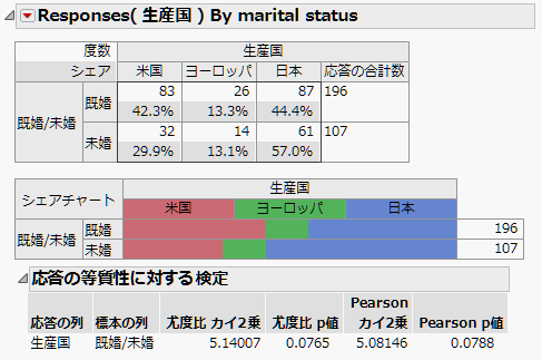 ここでは、自家用車に関する調査データである「Car Poll.jmp」サンプルデータを使用します。このデータには、回答者の属性情報と所有する車についての情報が含まれています。既婚/未婚と車の生産国との間の関係を調べてみましょう。また、応答の等質性に対する検定も行ってみましょう。つまり、車の生産国の分布が、既婚と未婚の回答者で同じなのかどうかを調べます。