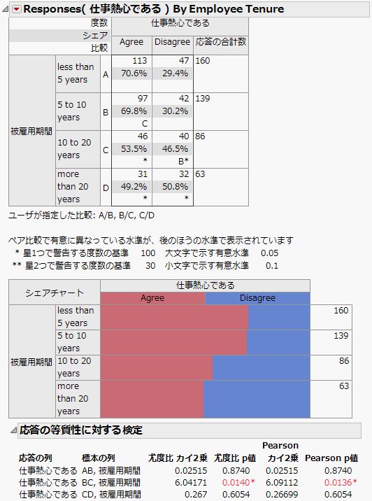 応答の等質性に対する検定では、AとB、BとC、そしてCとDを比較します。グループB(5~10年)は、グループC(10~20年)よりも「仕事熱心である」という質問に同意する割合が高いです。Pearsonのp値が0.0136であるため、これらの割合には有意な差があると言えます。
