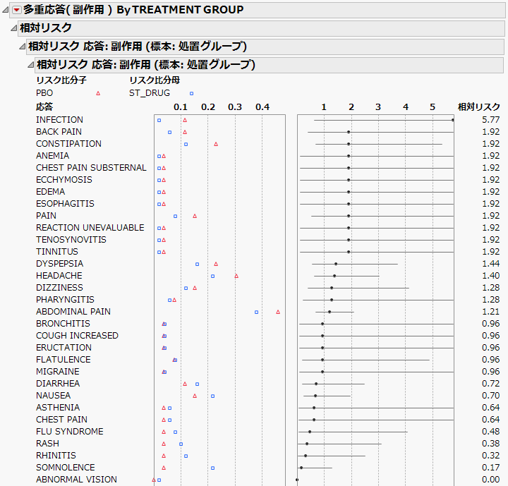 この例では「AdverseR.jmp」を使用します。このデータには、臨床試験での有害事象(副作用)についての情報が含まれています。このデータを使用して、有害事象の条件付き関連を調べてみましょう。また、対照群に対する処置群の相対リスクを求めてみましょう。