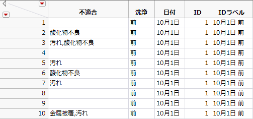 「Failures3Delimited.jmp」のデータは、ユニットごとに1つの行があり、不適合の列には、不適合の種類がカンマで区切られて記録されています。「Failure3Delimited.jmp」データテーブル(一部)のデータテーブルでわかるように、ユニットの一部は「不適合」列が空になっています。これは、不適合がまったく観測されなかったことを示します。