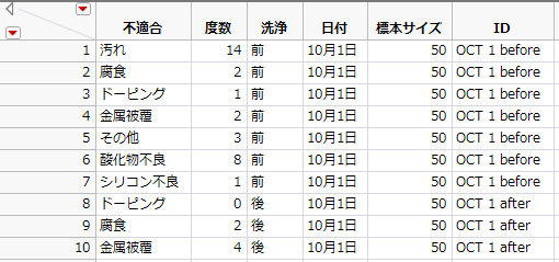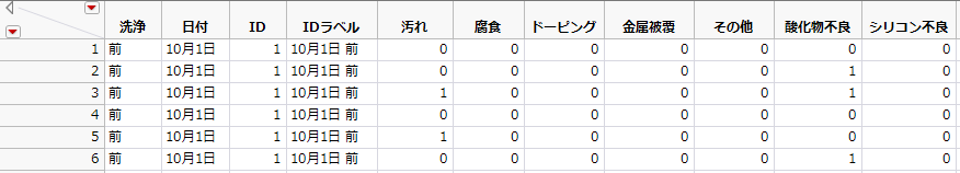 「Failure3ID.jmp」のデータは、バッチにおける1つの不適合ごとに1つの行となっており、各不適合の種類を示す列と、バッチのIDを示す列で構成されています。