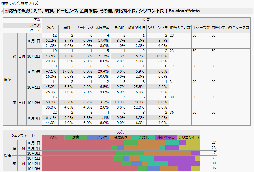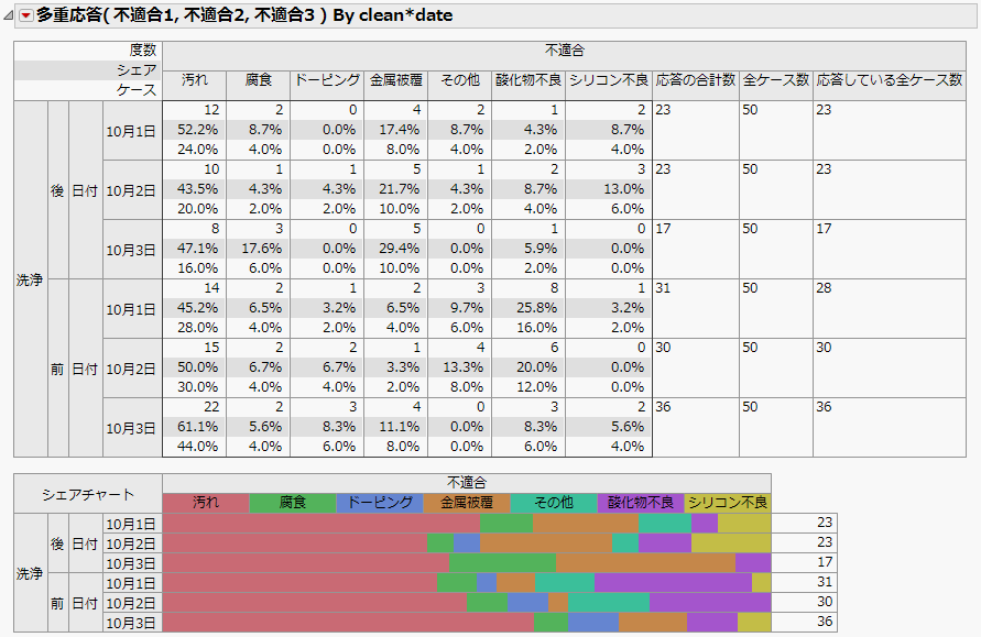 クロス表の[応答している全ケース数]列を除き、「多重応答」レポートと同じ結果です。この例では、分析対象の不適合データがすでに要約されていました。この要約されたデータには、不適合が0であるユニット数の記録はありません。そのため、この例の[応答している全ケース数]には、バッチサイズである50が表示されています。