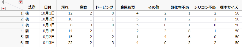 「Failure3Freq.jmp」のデータは、バッチごとに1つの行、各不適合の種類ごとに複数の列、バッチサイズについての1つの列で構成されています。各不適合列には、バッチにおける不適合の発生度数が入力されています。