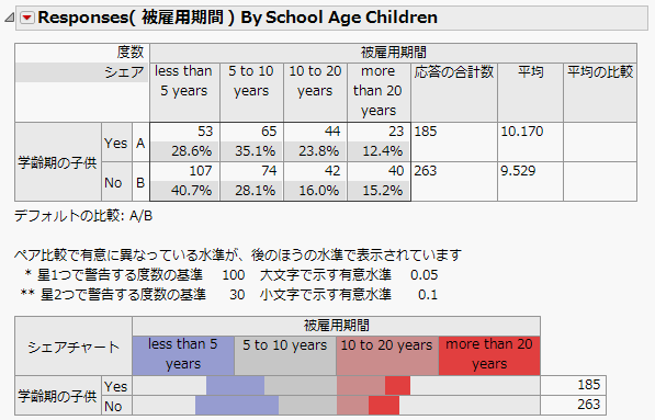 この例では「Consumer Preferences.jmp」を使用します。このデータで、被雇用期間と、学齢期の子供がいることの関係を調べます。「被雇用期間」列には、便宜的な通し番号として、1,2,3,4の数値が含まれています。そして、これらの値に対して、「値ラベル」列プロパティによって、ラベルが割り当てられています。「カテゴリカル」プラットフォームの[スコア平均]オプションで、被雇用期間の平均を求めるには、この列の値(1,2,3,4)に、被雇用期間を「値スコア」として割り当てる必要があります。列プロパティについての詳細は、『JMPの使用法』の「列情報ウィンドウ」章を参照してください。