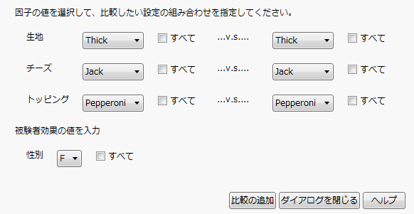 設定された選択肢の比較を行います。比較したい因子と値を選択することができます。なお、[すべて]チェックボックスをチェックした場合、すべての水準が比較されます。被験者効果がある場合は、製品の比較を行いたい、被験者の水準を指定できます。[すべて]チェックボックスを複数の因子でチェックした場合、それらすべての因子の水準での比較ではなく、該当する1 因子のすべての水準が、その他の因子を左側で選択されている水準に固定した上で、比較されます。