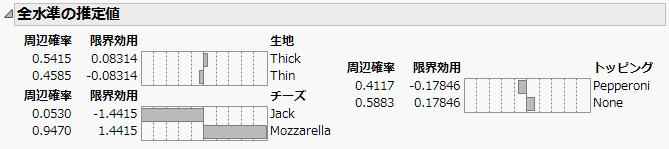 「全水準の推定値」の例において、(生地とトッピングは同じという条件で)被験者がモンテレージャックのピザではなく、モッツァレラのピザを選ぶ確率は、0.9470です。