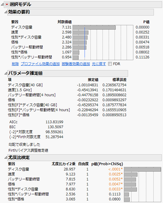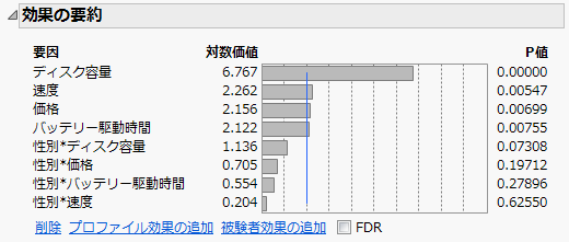 「効果の要約」レポートを見ると、「ディスク容量」が最も有意な効果であることがわかります。ここでは、p値が0.15を超えている効果を削除して、モデルをより単純なものにします。このとき、効果は1つずつ削除するほうがよいでしょう。この例では、「性別*速度」の効果が最も有意性が低く、p値が0.625となっています。