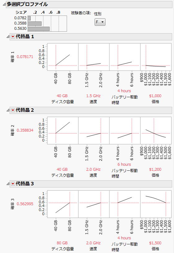 「ディスク容量」を40 GBから80 GBへと変更し、「価格」を$1,200にすると、基準の製品とこの新製品の2つが選択肢にある場合、女性が新製品のほうを選択する確率は0.90です。「性別」を[M](男性)に変更してみましょう。男性におけるこの確率を見ると0.71になっています。