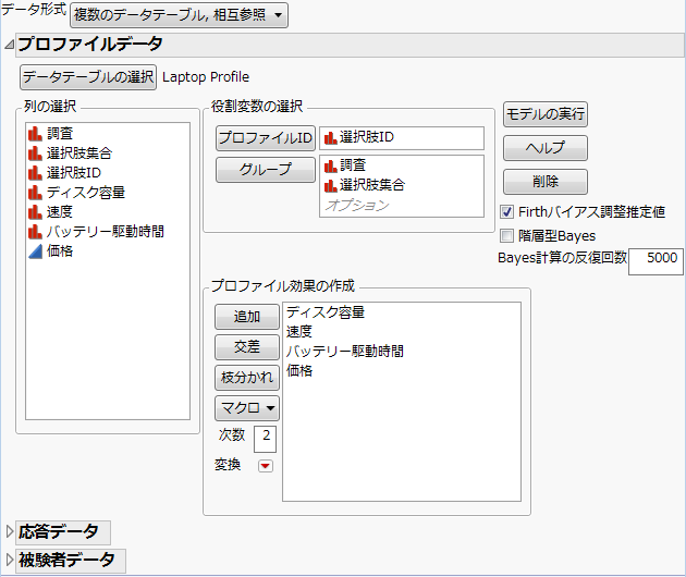 [データテーブルの選択]をクリックし、リストから「Laptop Runs.jmp」を選択します。