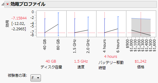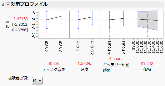 「性別」と「ディスク容量」との交互作用は、p値が0.0033となっており、高度に有意です。詳細については、ノートパソコン調査の結果を参照してください。「効用プロファイル」で「性別」の両水準の「ディスク容量」を確認すると、 男性よりも女性のほうが傾きが大きいことがわかります。