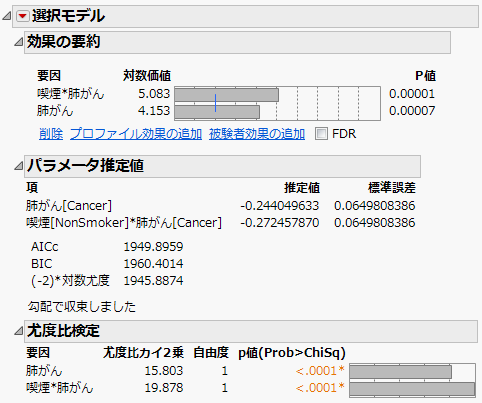 選択モデルにおける「喫煙*肺がん」の尤度比カイ2乗検定が、ロジスティックモデルにおける「喫煙」の尤度比カイ2乗検定と一致しています。「選択モデル」を使ったロジスティック回帰と「モデルのあてはめ」を使ったロジスティック回帰のレポートから、喫煙が肺がんの発病に対して高度に有意であることが分かります。詳細については、『基本的な回帰モデル』の「ロジスティック回帰」章を参照してください。