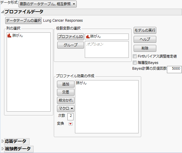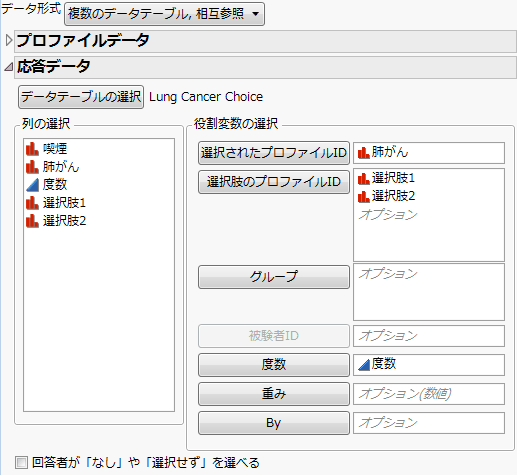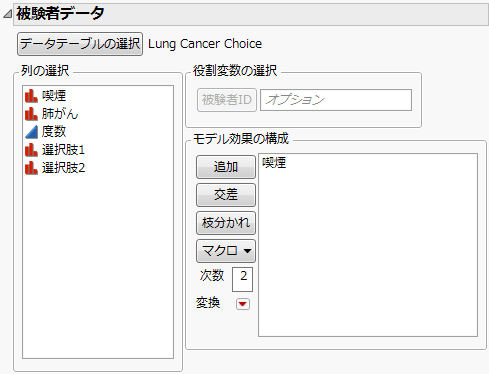 [ヘルプ]>[サンプルデータライブラリ]を選択し、「Lung Cancer Responses.jmp」と「Lung Cancer Choice.jmp」を開きます。