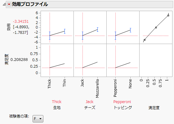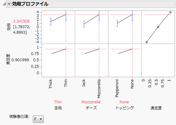 「効用プロファイル」の赤い三角ボタンをクリックし、[最適化と満足度]>[満足度関数]を選択します。