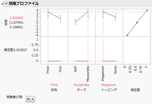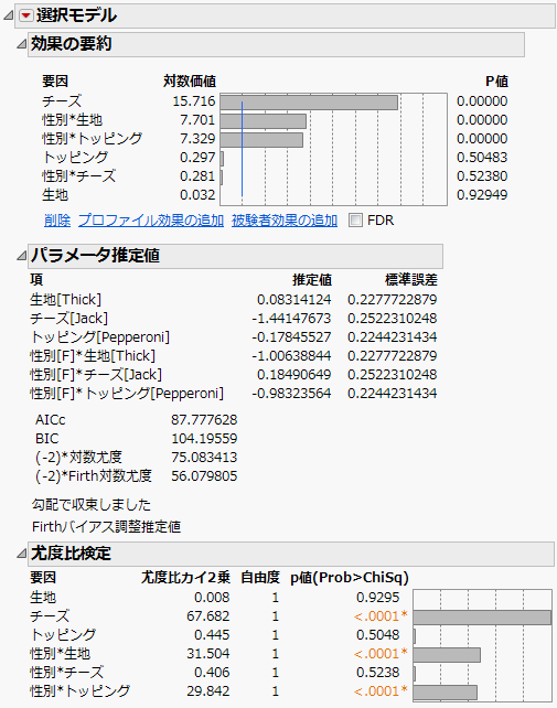 モデルに6つの効果が含まれています。「生地」、「チーズ」、「トッピング」は商品属性です。「性別*生地」、「性別*チーズ」、「性別*トッピング」は、被験者効果と商品属性の交互作用です。これらの交互作用を検討することにより、各マーケットセグメントに好まれる商品を探すことができます。