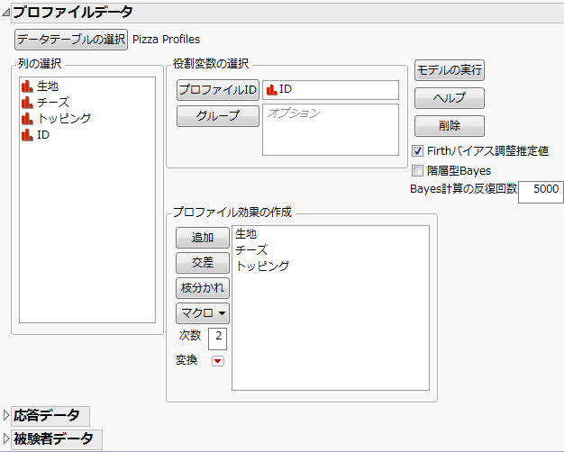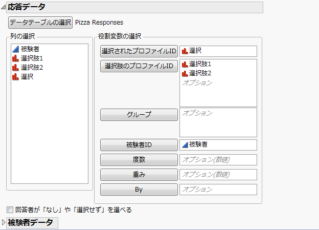 この節でも、3つの属性をもつピザを調べた実験を例にします。回答者は、好きなピザを必ず選択しなければならないものとします。ここでは、「Pizza Profiles.jmp」、「Pizza Responses.jmp」、「Pizza Subjects.jmp」の3つのデータテーブルを使用します。選択実験のデータは、常に1つのデータテーブルにまとめることもできますが、特に分析に含めたいプロファイル変数や被験者変数が他にもある場合は、複数のデータテーブルを使用する方が便利です。