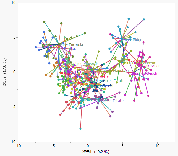 多重因子分析(Multiple factor analysis; MFA)は、主成分分析(Principal Components Analysis: PCA)を発展させた手法です。多重因子分析は、主成分分析と同じように、多変量データを固有値分解によって互いに直交する主成分に変換します。いくつかの同じ商品や食品に対して異なった評価者から得たデータを分析する場面で、多重因子分析は特に役立ちます。多重因子分析で得られた主成分は、各商品が互いにどれだけ類似しているか、または異なっているかを判断するのに役立ちます。多重因子分析では、複数のデータに対する主成分分析を個別に行った後、全体に対する主成分分析を行います。
