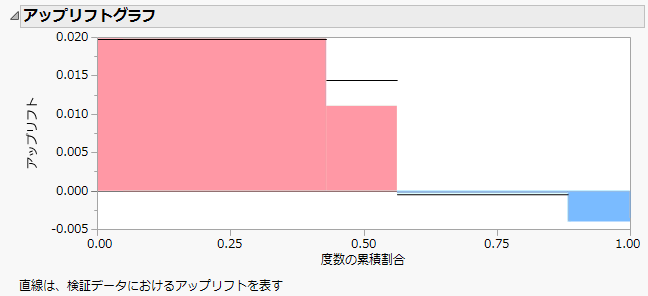 アップリフトグラフは、「Hair Care Product.jmp」サンプルデータで、3回分岐した後のアップリフトグラフの例です。被験者のうち、2つのグループ(男性と、年齢 ≥ 42のブロンドの女性)で、広告の効果がマイナスとなっています。