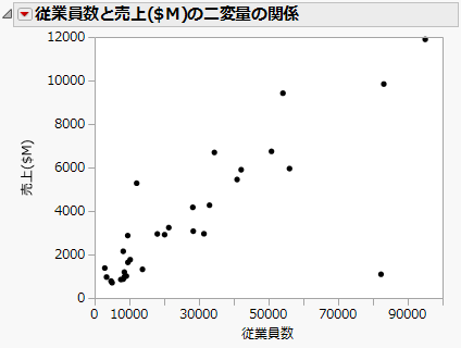 まず、散布図を作成し、従業員数と売上の関係を確認します。この散布図は、「データの視覚化」の章の「散布図の作成」(91ページ)ですでに作成しました。1つの外れ値(従業員数と売上が他社より抜きん出ている会社)を非表示にし、かつ除外した後の散布図を「売上($M)」と「従業員数」の散布図に示します。
