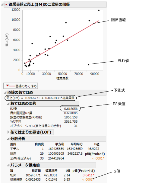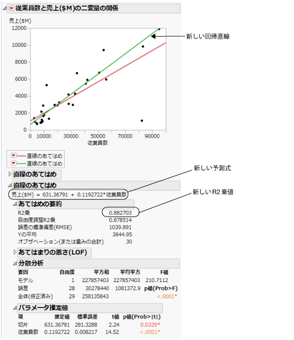 従業員数から売上を予測するには、回帰モデルをあてはめます。「二変量の関係」の赤い三角ボタンをクリックし、メニューから[直線のあてはめ]を選択します。散布図に回帰直線が追加され、新しいレポートがレポートウィンドウに追加されます。