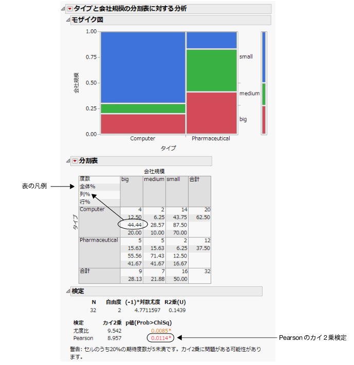 差があることを確認するには、「検定」レポートにおけるPearsonのカイ2乗検定のp値を見ます。会社タイプ別の会社規模を参照してください。p値0.011は有意水準0.05よりも小さいため、次の結論を導き出せます。