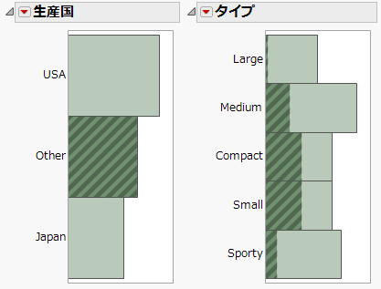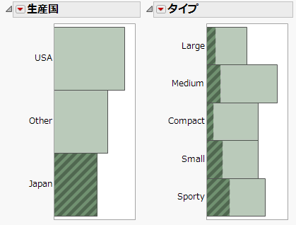 片方のグラフで棒を選択すると、別のグラフでも対応するデータが選択されます。たとえば、「生産国」の棒グラフで「Japan」の棒を選択すると、日本車にはスポーツカー(Sporty)が多いことがわかります。