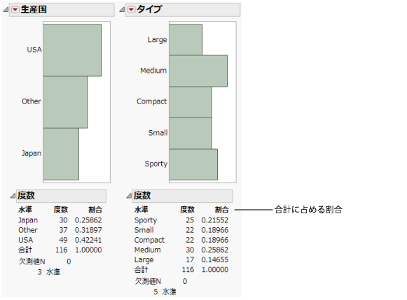レポートウィンドウには、「生産国」と「タイプ」について、棒グラフと度数レポートが表示されます。棒グラフは、「度数」レポートに示されている度数情報をグラフで示しています。「度数」レポートには、次の情報が表示されます。