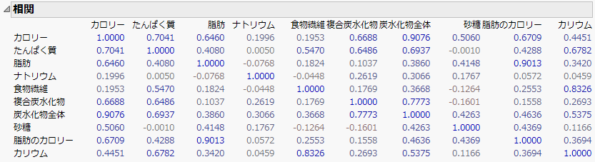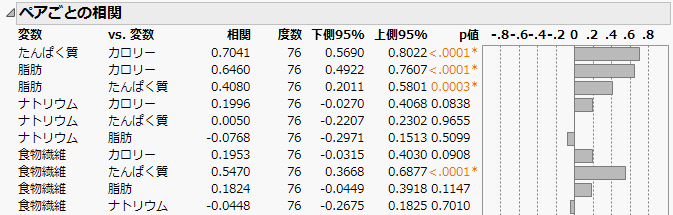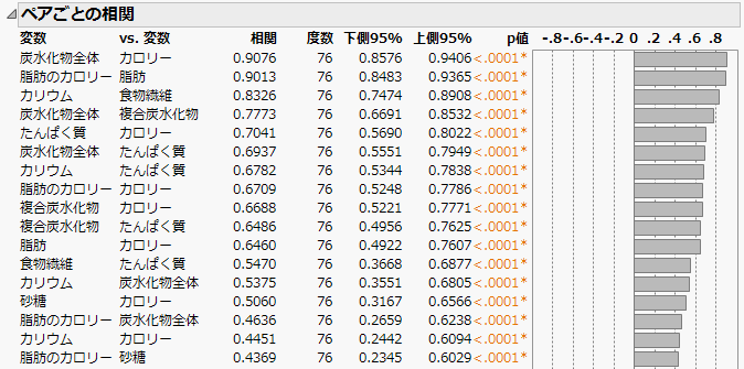 「多変量」の赤い三角ボタンのメニューから、[ペアごとの相関係数]を選択して、「ペアごとの相関」レポートを表示します。
