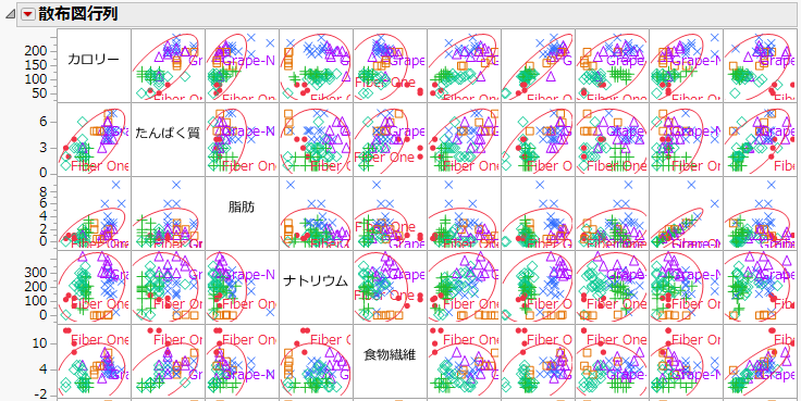 散布図行列上の確率楕円を見ると、変数間の関係をさらに深く理解できます。散布図行列(一部)は、散布図行列の一部です。