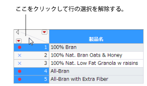 「Cereal.jmp」データテーブル内で、列パネルの対角線より左下側部分をクリックして行の選択を解除します(行の選択解除)。
