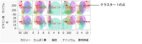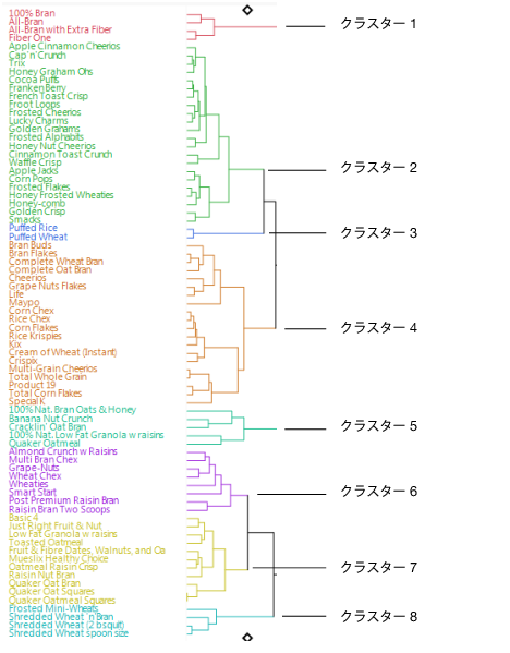 クラスター分析は、多変量データにおいて近い値となっている行をグループにまとめる手法です。階層型クラスター分析を実行すると、データ行を結合していった結果が樹形図で示されます。クラスター分析を行うと、「食物繊維が多い」などの似た特徴をもつシリアルが、同じクラスターに分類されます。