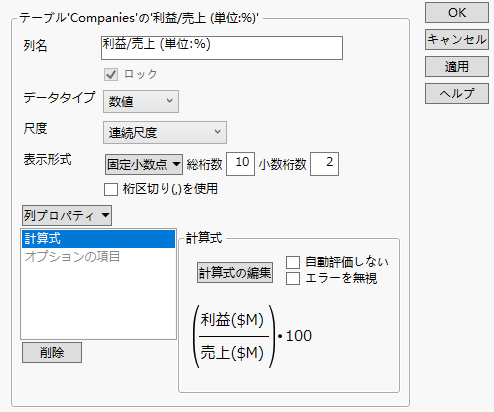 計算式、ノート、値の順序など、列の特別なプロパティを設定します。『JMPの使用法』の「列情報ウィンドウ」章を参照してください。