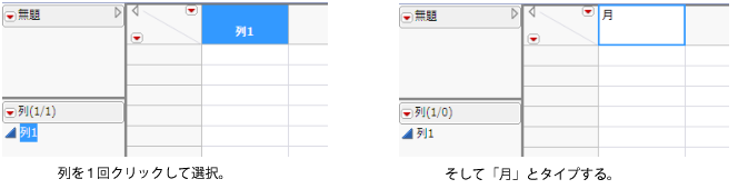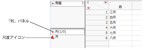 「列」パネルで、列名の左側にある尺度アイコンを確認します。「月」が名義尺度になったことを反映してアイコンが変化しています(変化前は連続尺度)。列名の入力で「列1」に対して表示されている尺度と、完成した「月」列で「月」に対して表示されている尺度を比較してください。この違いは重要です。詳細については、第 “列情報の表示または変更”で説明します。