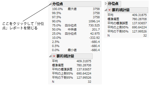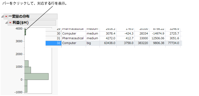 プラットフォームの結果は、元のデータテーブルにリンクしています。プラットフォームの結果とデータテーブルとの対応のヒストグラムは、1つの会社グループが、他社よりもはるかに利益を上げていることを示しています。この会社グループをすばやく特定するには、ヒストグラム上の対応する棒をクリックします。すると、データテーブル内の対応する行が選択されます。