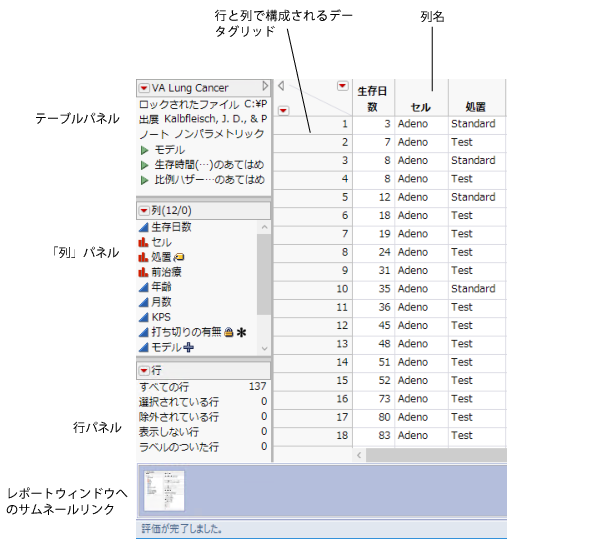 データグリッドは、行列構成でデータを格納します。一般には、データグリッドの各行がオブザベーションであり、列(変数とも呼びます)がオブザベーションに関する情報を提供します。データテーブルでは、各行が被験者に対応し、12列分の情報があります。データグリッドでは12列の一部しか表示されていませんが、列パネルではすべての列が一覧表示されています。被験者ごとに、「生存日数」、「セル」、「処置」などの情報が記録されています。各列には見出し(列名)があります。列名は、テーブルの行数の合計には含まれません。