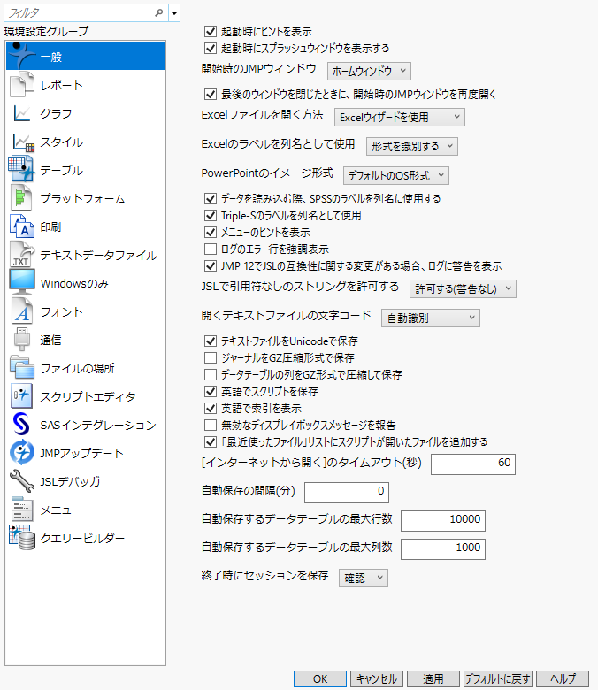 JMPの環境設定は「環境設定」ウィンドウで変更できます。「環境設定」ウィンドウを開くには、