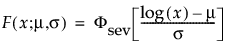 Weibull分布に従う確率変数を対数変換すると最小極値分布に従うことに基づき、Weibull分布の確率密度関数と累積分布関数は、次のようにこれらのパラメータで表されます。なお、μ = log(α)と σ = 1/βという関係になっています。