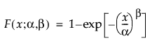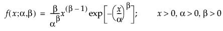 この節では、それらの分布の確率密度関数と累積分布関数を説明します。Weibull分布の詳細については、『信頼性/生存時間分析』の「寿命の一変量」章を参照してください。